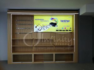 Brother Kiosk display shelves with hooks for hanging products and a lightbox advertising sign, designed, produced, and fully installed by The Infinity Grand, trusted by