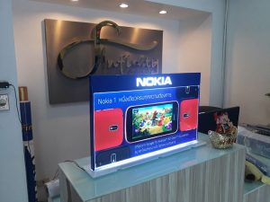 Nokia Media Lightbox Stand made with high-quality, durable acrylic. The lightbox has media attached and is covered with a slim lightbox on both sides.