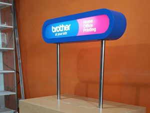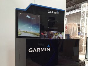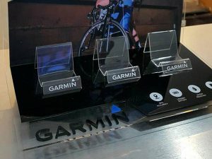 The GARMIN product display is made from clear acrylic, decorated with stickers and media.