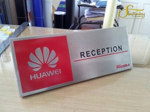 The Huawei stainless silk screen is made from high-quality stainless steel, folded into a triangular shape for tabletop display, and silk-screened.